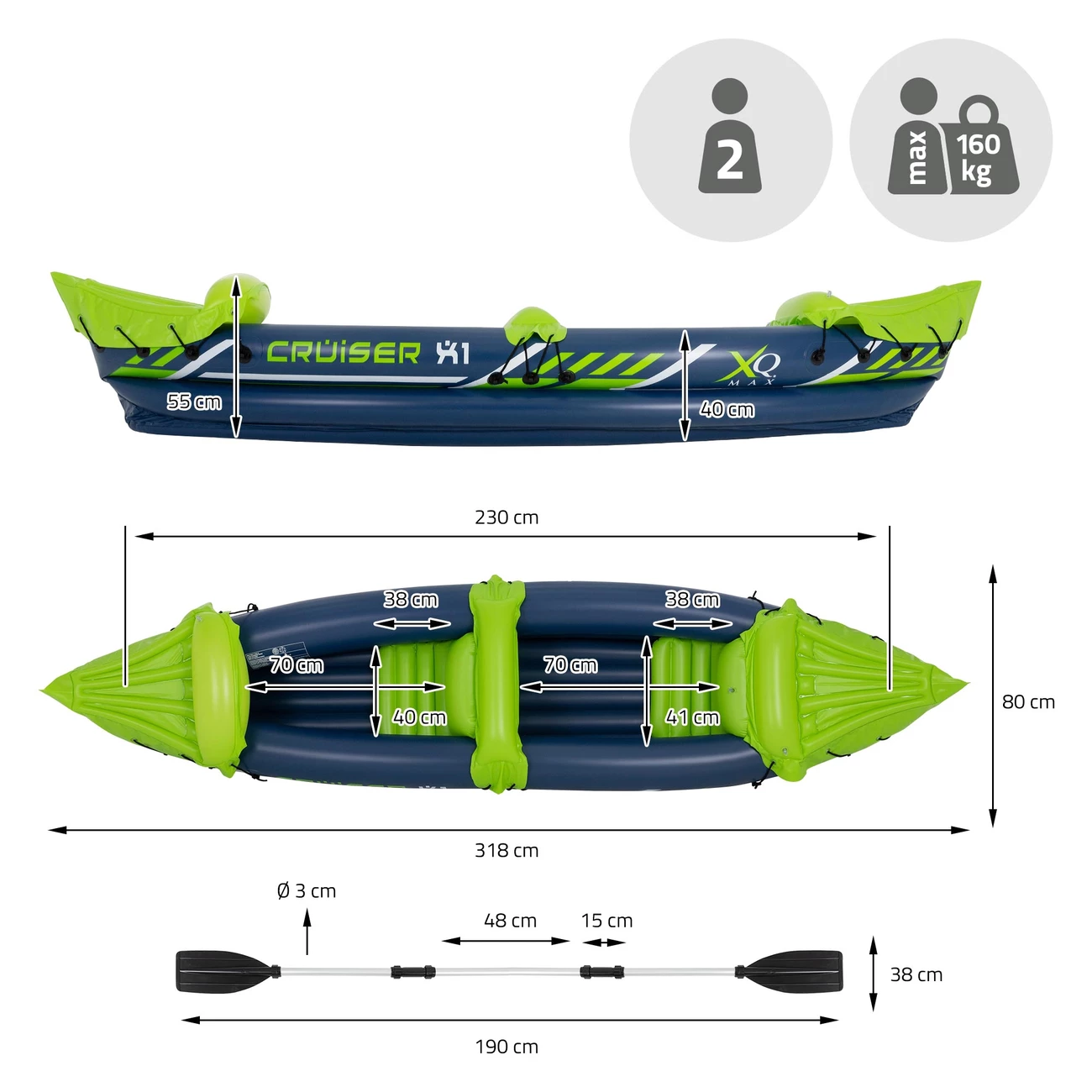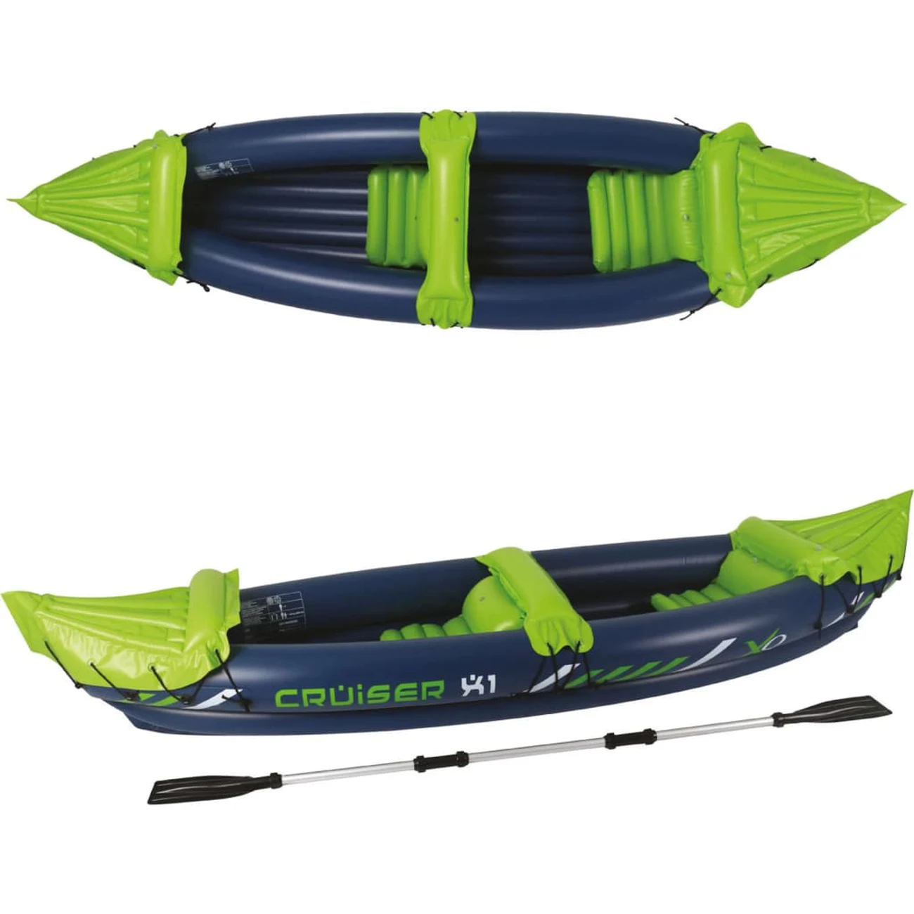 Le kayak gonflable est fait de polypropylène, ce qui le rend robuste et durable. Le kayak Cruiser X1 convient à un poids maximal de 160 kg. Il est rapide à gonfler et à dégonfler grâce à sa soupape. Le kayak est doté de deux sièges gonflables, y compris une pagaie de kayak en aluminium et une corde d’appui pour plus de sécurité.