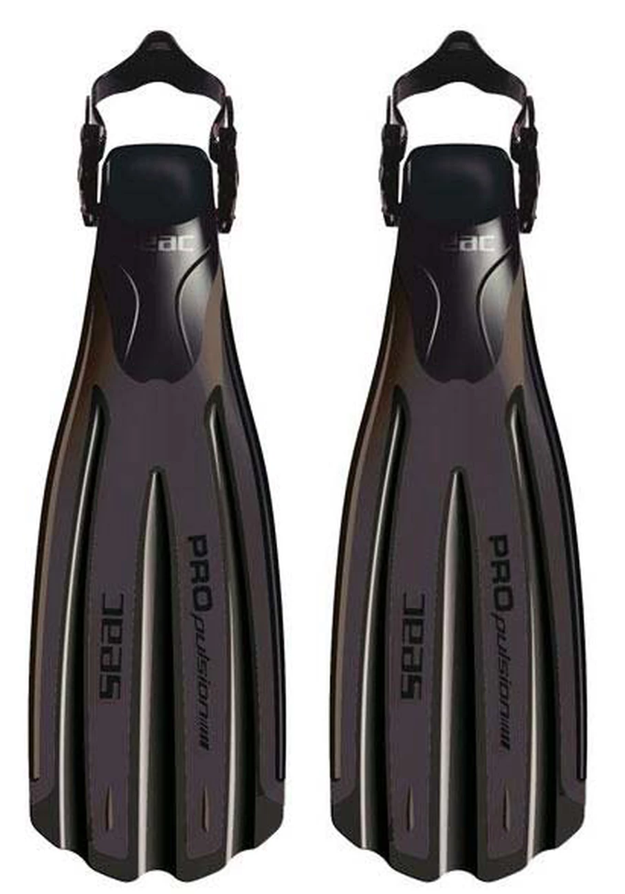 Palmes Réglables Seacsub Propulsion. Caractéristiques: – Canalisateurs deau et dérive.- Nervure extérieure.- Voilure en technopolymère avec formulation spéciale.- Matériau de la voilure: technopolymère à haute module – Matériau de la partie chaussante: caoutchouc thermoplastique