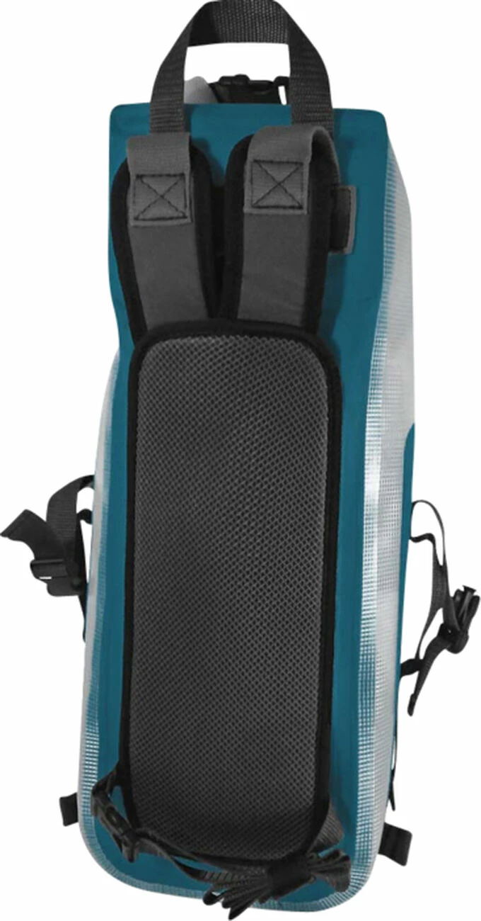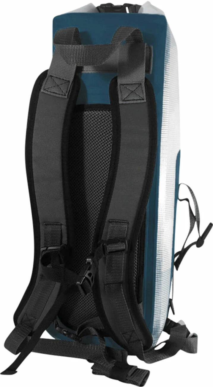 Ce sac à dos de 25L est étanche à la norme IP67 et donc submersible grâce à sa fermeture par enroulement. Il peut se fermer sur les côtés pour un look plus urbain soit par le haut pour un aspect plus outdoor. Les côtés du sac sont en PVC transparent ce qui permet de repérer facilement ses affaires. Les bretelles sont escamotables et peuvent se ranger dans la dorsale, pratique pour le fixer sur votre paddle /vélo /moto ou pour empêcher les bretelles de s’accrocher dans les bagages en soute. Celles-ci sont fabriquées en mousse EVA pour un confort maximum et son munies d’une sangle pectorale réglable en hauteur avec sifflet de secours. Il dispose d’une petite poche zippée à l’intérieur pour vos accessoires type clefs, téléphone, portefeuille et d’une poche imperméable à l’extérieur. Un patch frontal a aussi été ajouté pour pouvoir clipser sur son sac une lampe (type vélo ou frontale).